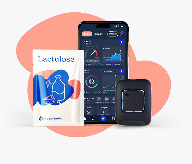 When you have SIBO, bacteria that don’t belong in the small intestine begin fermenting food too early. This releases gases like hydrogen and methane. These gases move into your bloodstream and are exhaled in your breath — where your FoodMarble device, clinically validated, can measure them.